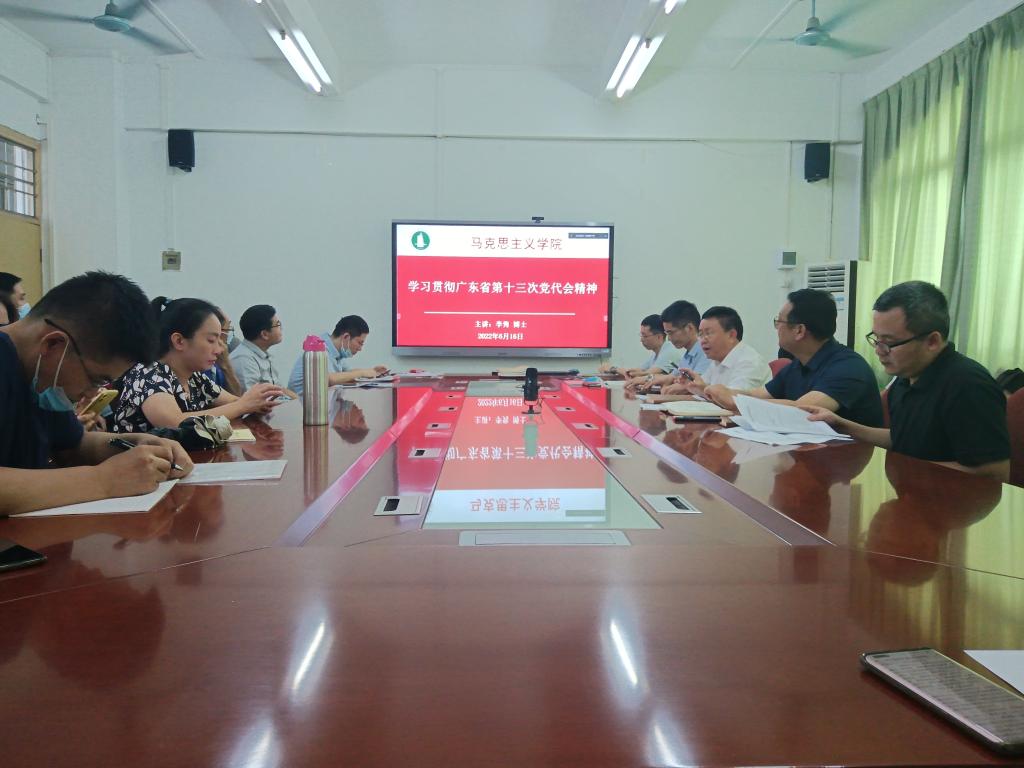 2022年6月16日下午,马克思主义学院在东校区第一教学楼1311室,组织教师学习贯彻广东省第十三次党代会精神,李隽博士作了专题报告。会议由学院党委书记房亚兵同志主持,学院全体教职工出席了会议。