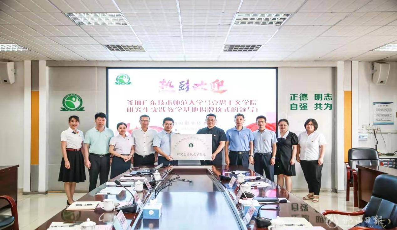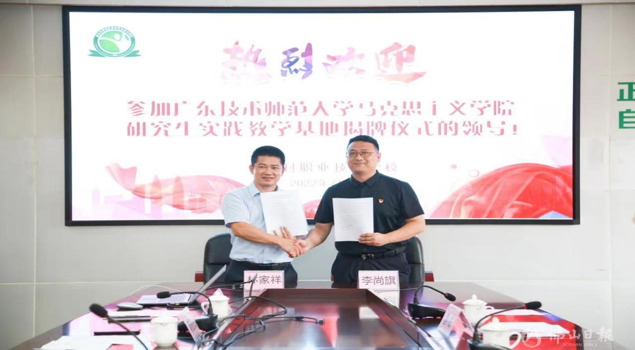 2022年7月1日,广东技术师范大学马克思主义学院院长李尚旗、广东省中等职业学校德育研究与指导中心主任汪永智、广东技术师范大学马克思主义学院副院长唐斌以及研究生工作秘书杨梦琳老师一行四人赴佛山市顺德区陈村职业技术学校进行交流,双方举行了共建研究生联合培养实践教学基地的签约仪式。陈村职业技术学校校长林家祥等七位领导、老师出席了签约仪式。